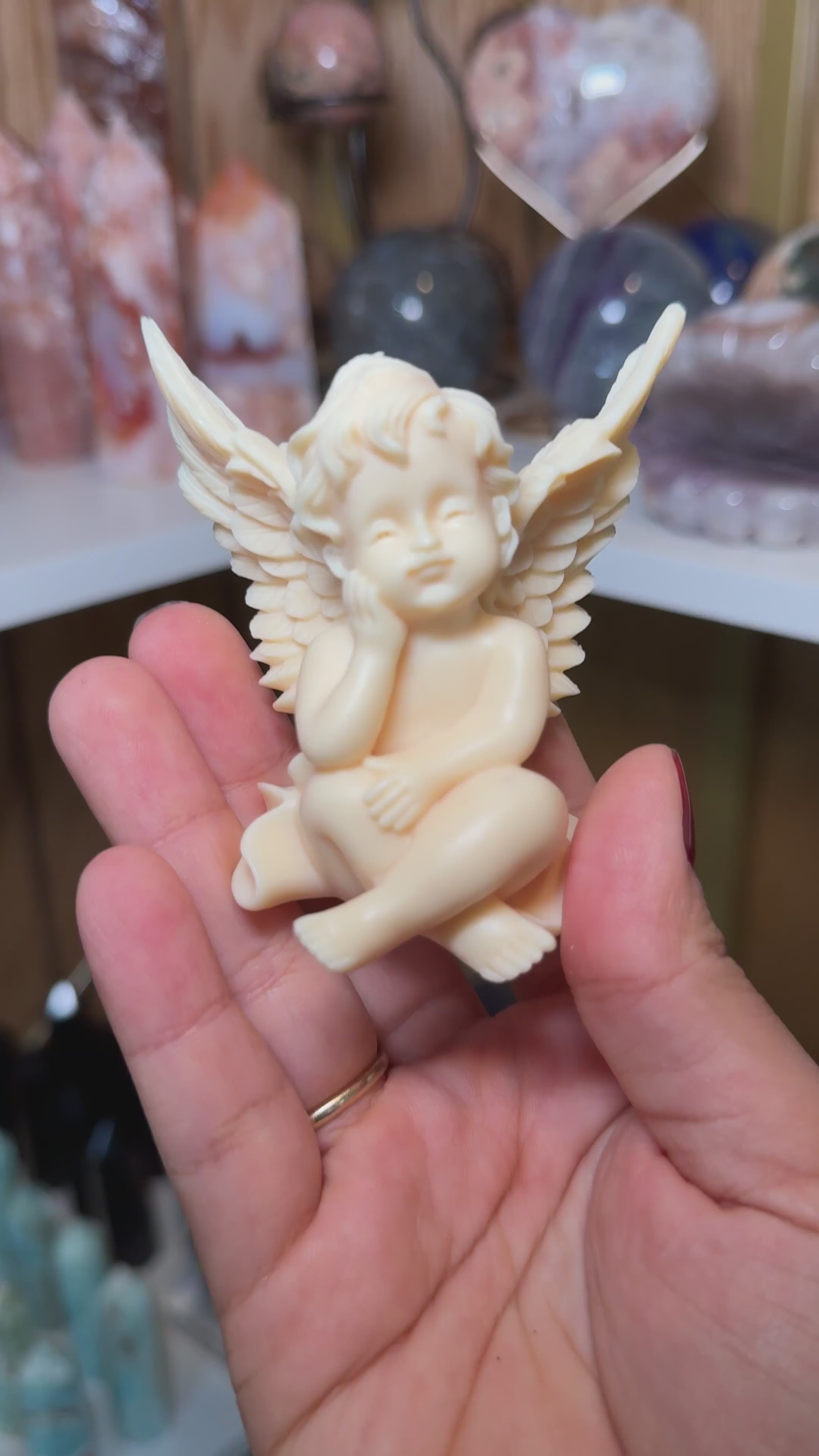 Beautiful yellow hue in these hand carved angels.